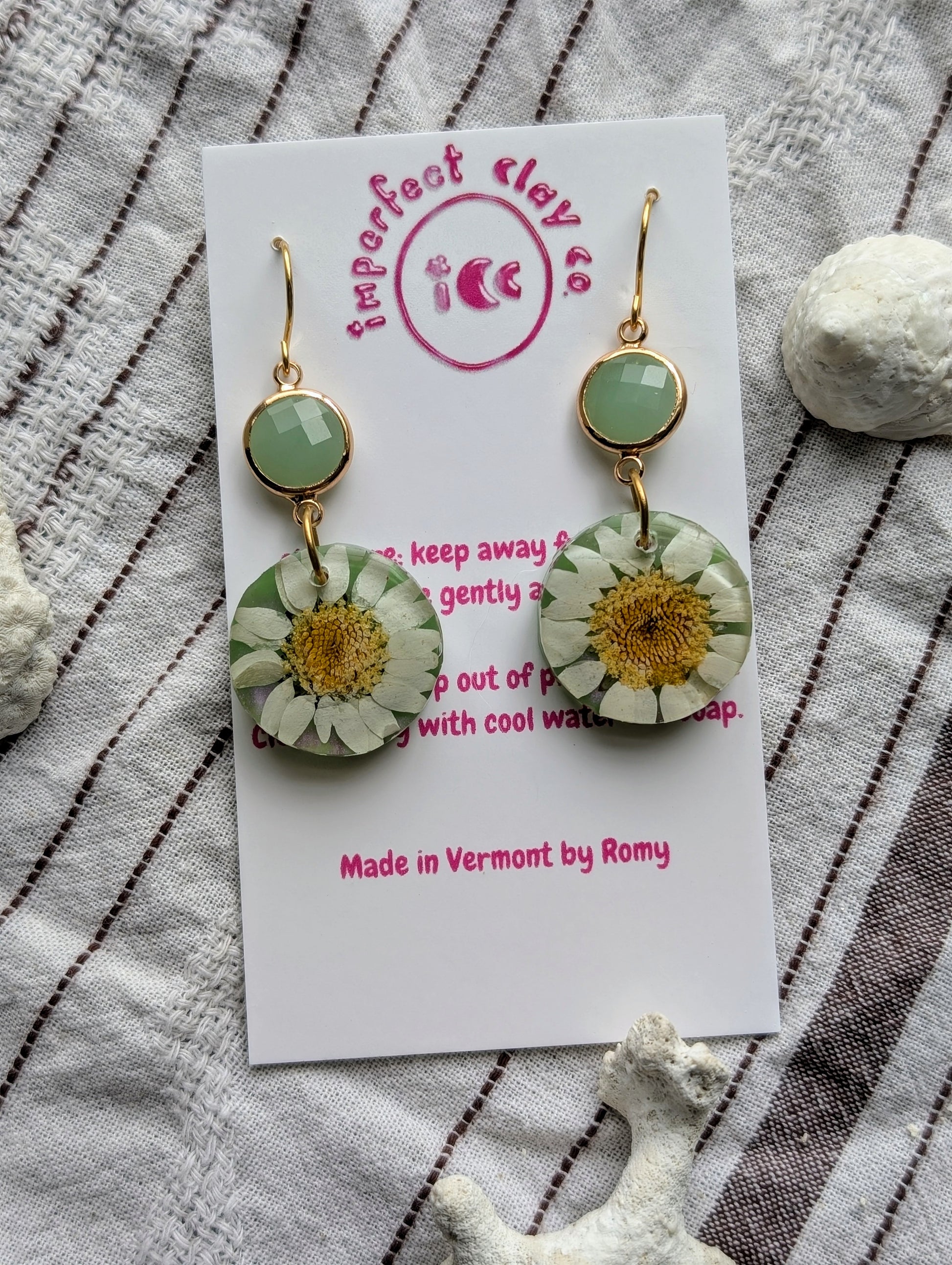 Natural daisy flowers on a sea-foam green background. Brass pieces and beads. These are on a hypoallergenic hook.