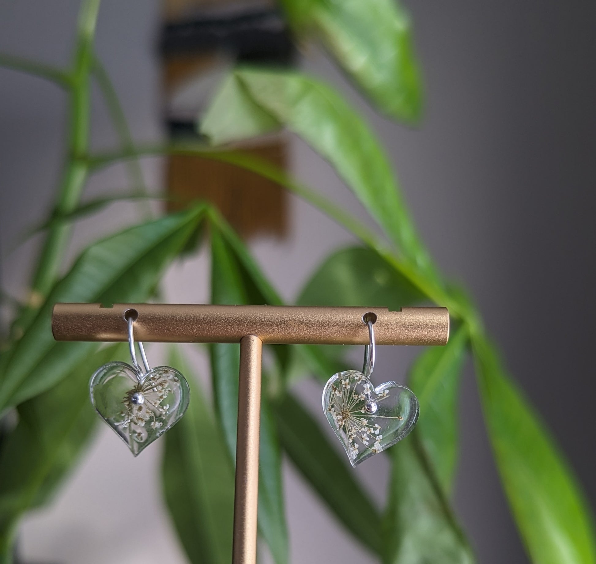 Natural Carrot Flower heart earrings. These are on a hypoallergenic hook.